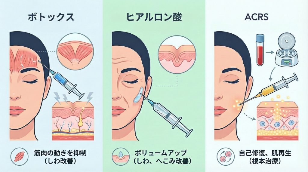 一方、ACRS療法は、肌そのものの再生力に働きかけ、時間をかけて自然な変化を目指す点が大きな違いです。